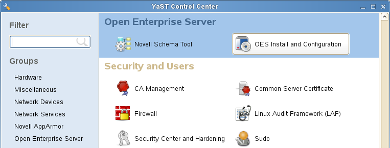 In YaST, select Open Enterprise Server > OES Install and Configuration.