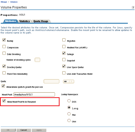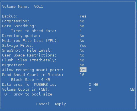 On the Volumes page, view the volume properties to ensure that the attribute Allow renaming mount point has been enabled. If it is disabled, select the attribute value, press y (Yes) to enable it, then select Apply and press Enter.