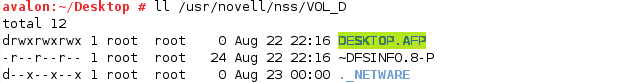 For example, the following is the list for a new NSS volume. You should see the default ~DFSINFO.8-P file and the hidden ._NETWARE directory. If AFP is enabled as an advertising protocol, the DESKTOP.AFP directory is also present. For an existing volume that contained user data, you should also see additional directories listed.