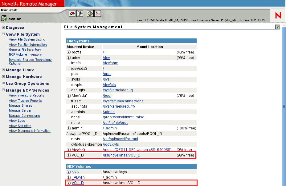 On the File System Management page, view the mount information for the NSS volume under File Systems, and view its NCP instance under NCP Volumes. Note that both volumes are mounted at the new mount point location /usr/novell/nss/VOL_D.
