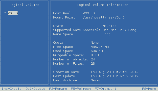 For example, the mount point in this example should display /usr/novell/nss/VOL_D.