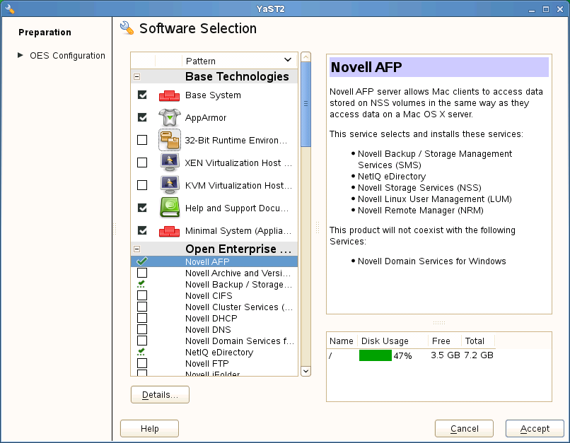 In the YaST install for OES, on the Installation Settings page, click Software to go to the Software Selections page.
