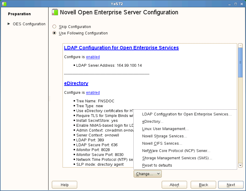 On the Novell Open Enterprise Server Configuration window, click Change and then click Novell CIFS Services.
