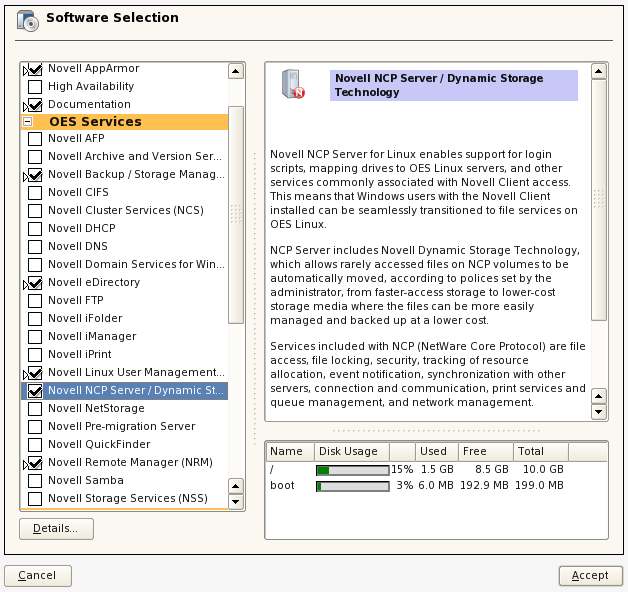 When you select Novell NCP Server / Dynamic Storage Technology, the following additional OES Services options are automatically selected: