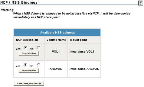 Verify that the NSS volume is available for NCP by selecting Manage NCP Services > Manage Shares to view a list of active volumes.
