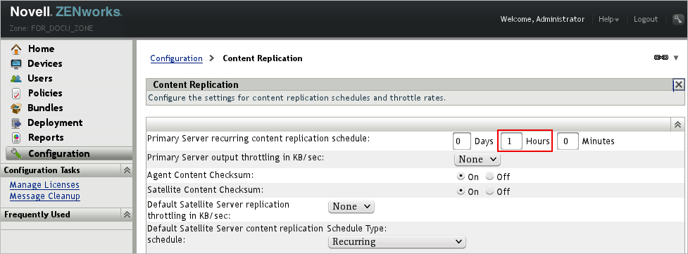 The content replication schedule determines how much time elapses before replication between Primary Servers and/or to Satellite servers. You change this setting in Configuration > Content Replication. The default value is 1 hour. You should increase it to 4 hours: