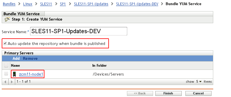 In the following dialog window, leave the Auto update the repository when bundle is published check box selected. In addition, at least one Primary Server that hosts the YUM service must be selected before you click Finish.