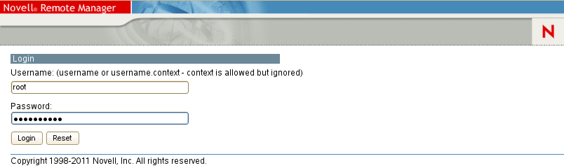 You typically log in as the Linux root user to manage all functions in Novell Remote Manager. The root user can access Novell Remote Manager even when eDirectory is not available.