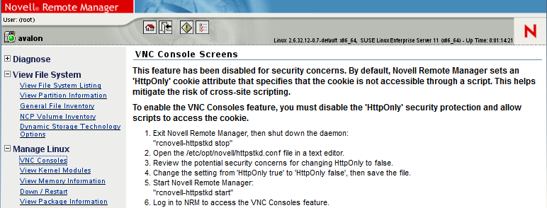 IMPORTANT:VNC access is disabled by default to prevent cross-site scripting. You must disable the HttpOnly setting in the /etc/opt/novell/httpstkd.conf file in order to enable the VNC console display. For information, see Section A.5, HttpOnly Command.