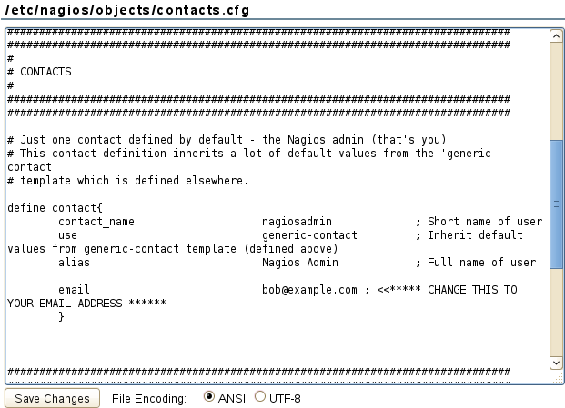 This opens the /etc/nagios/objects/contacts.cfg file in the Novell Remote Manager text editor.