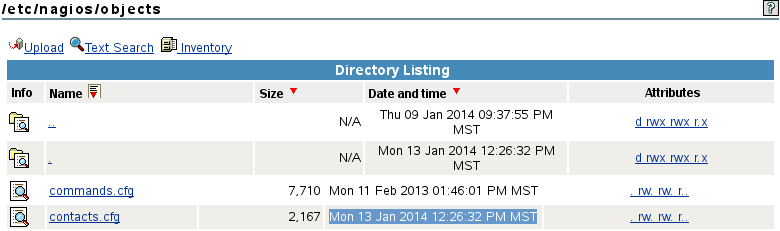 Templates for Nagios object configuration files are in the /etc/nagios/objects directory. When you start or restart Nagios, it caches the object definitions in the /var/lib/nagios/objects.cache file. The CGIs read information from the cache file, rather than directly from the object configuration files, in order to prevent inconsistencies that can occur if you modify the configuration files after Nagios starts. Thus, if you modify a configuration file, you must restart Nagios to apply the change.