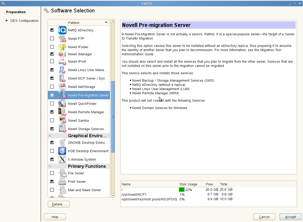 IMPORTANT:Select the Novell Pre-migration Server option at the start of the OES 11 installation; otherwise, an eDirectory replica is installed on the server and it cannot be the target server for Transfer ID migration. If the target server already has OES 11 installed, without the Novell Pre-migration Server option selected, then selecting this option later does not prepare the target server for Transfer ID migration until you reinstall OES 11 and select this option.