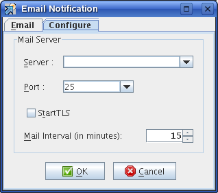 Specify the mail interval (in minutes) to send email messages for errors encountered. The default time is 15 minutes, but you can increase or decrease the interval as necessary. The email messages are sent only if error notification in the Email tab is set and if errors are encountered.