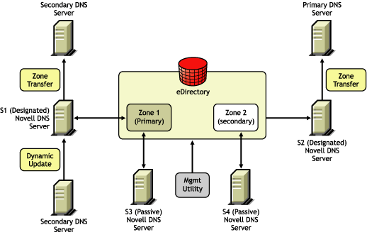 • DNS data is centrally managed in eDirectory, so all servers associated with a zone become primary or secondary. You get the benefit of all zones being primary, as opposed to a single zone being primary.