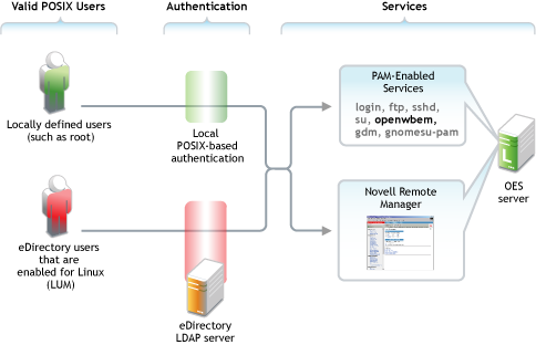 Figure 4-1 illustrates how LUM works with PAM-enabled services. For more detailed information, see Linux User Management: Access to Linux for eDirectory Users