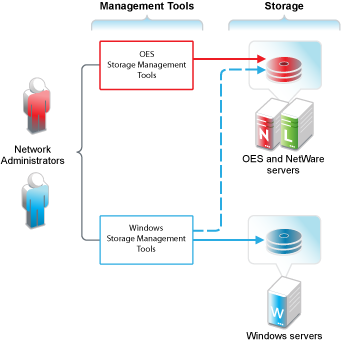 Network administrators use native OES and Windows storage management tools to create and manage storage devices on OES and Windows servers, respectively. Windows management tools can also manage share access rights and POSIX file system rights on DSfW storage devices after the shares are created. They cannot create the shares or perform other device management tasks. |