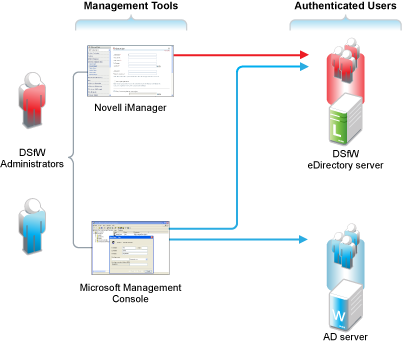 iManager manages DSfW users like other eDirectory users. MMC manages both AD users and DSfW users as though they were AD users. |