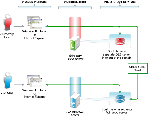 On OES servers, file storage services are provided by Samba to NSS or traditional Linux file systems. For eDirectory users, access to storage on Windows servers is available through a cross-forest trust. Access rights are granted by the AD administrator following the establishment of the cross-forest trust. |