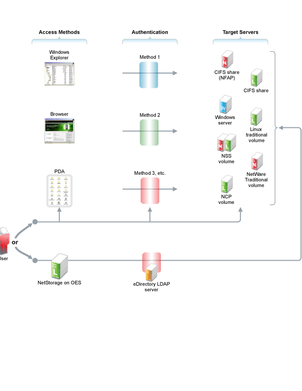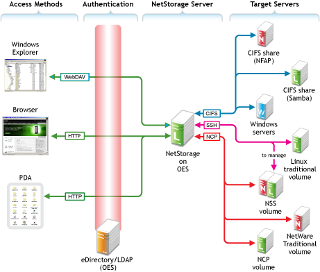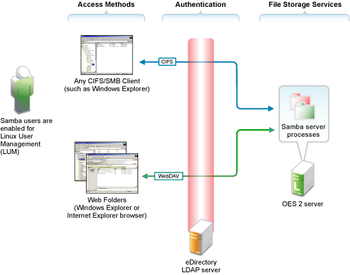 All file service access is controlled by LDAP-based authentication through the eDirectory LDAP server. Although shown separately, eDirectory could be installed on the OES server. |