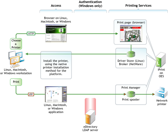 Print Driver Store: This is a repository that stores the drivers on an OES server for your network printers. It is the first component you configure and is represented by an eDirectory object that you create. It corresponds to the Print Broker on NetWare.