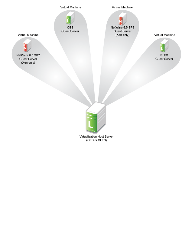Figure 9-1 illustrates how a single VM host server can support multiple VM guest servers that in turn provide OES services.