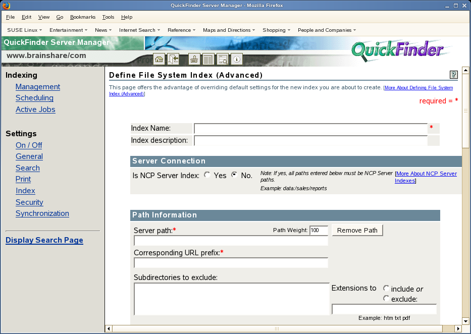 Under Path Information, specify the absolute path to the folder containing the information that you want indexed in the Server path field (for example, /var/lib/qfsearch/data).