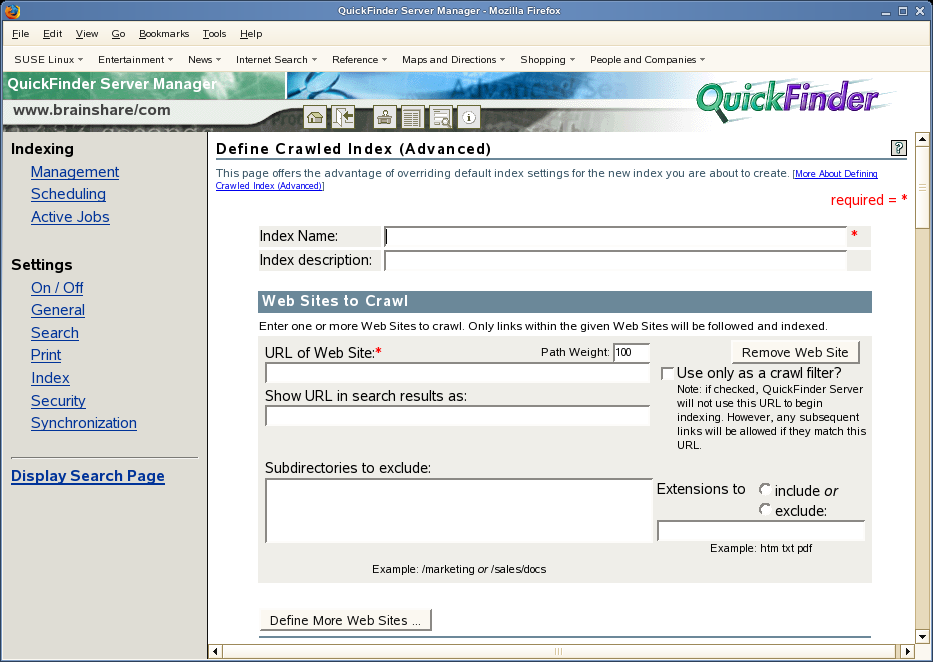 In the Maximum index depth field, specify the number of jumps (or links) from the starting URL that QuickFinder should crawl.