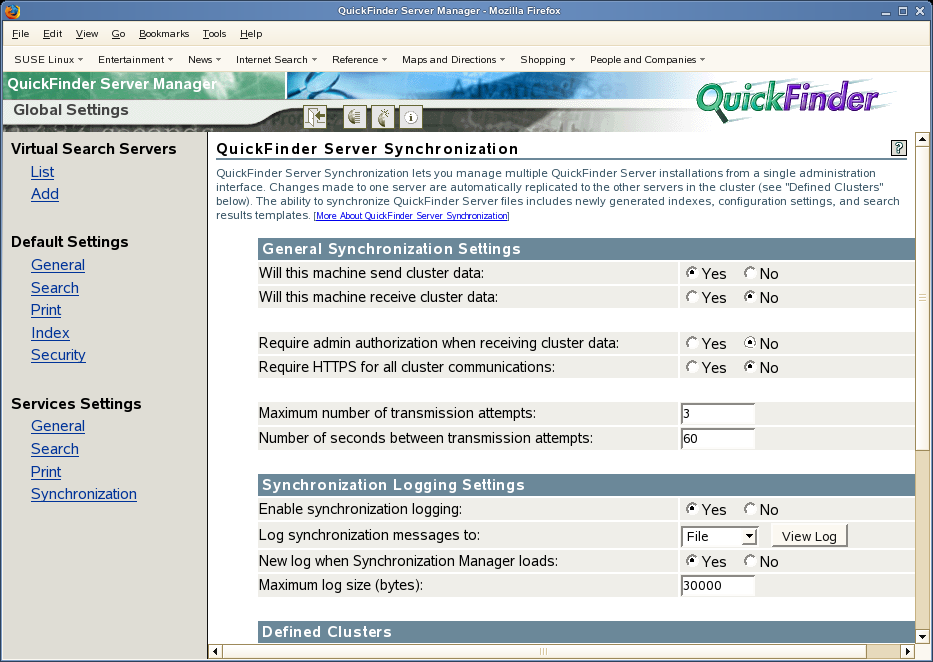 (Optional) Under Synchronization Logging Settings, click Yes next to Enable synchronization logging if you want QuickFinder to log cluster-related errors.
