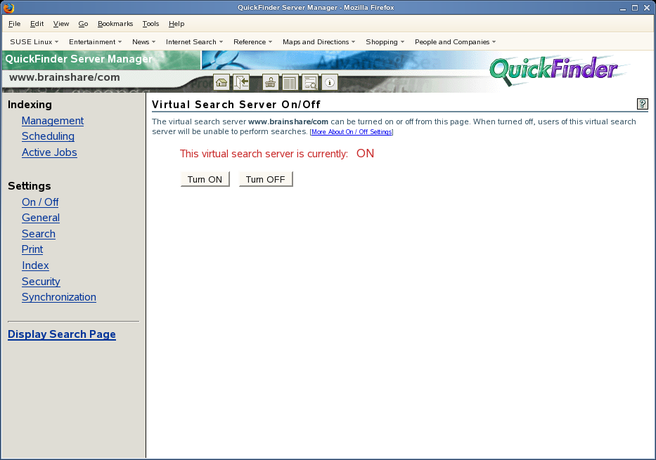 When QuickFinder turns off the current virtual search server, the status above the Turn ON and Turn OFF buttons changes to OFF.
