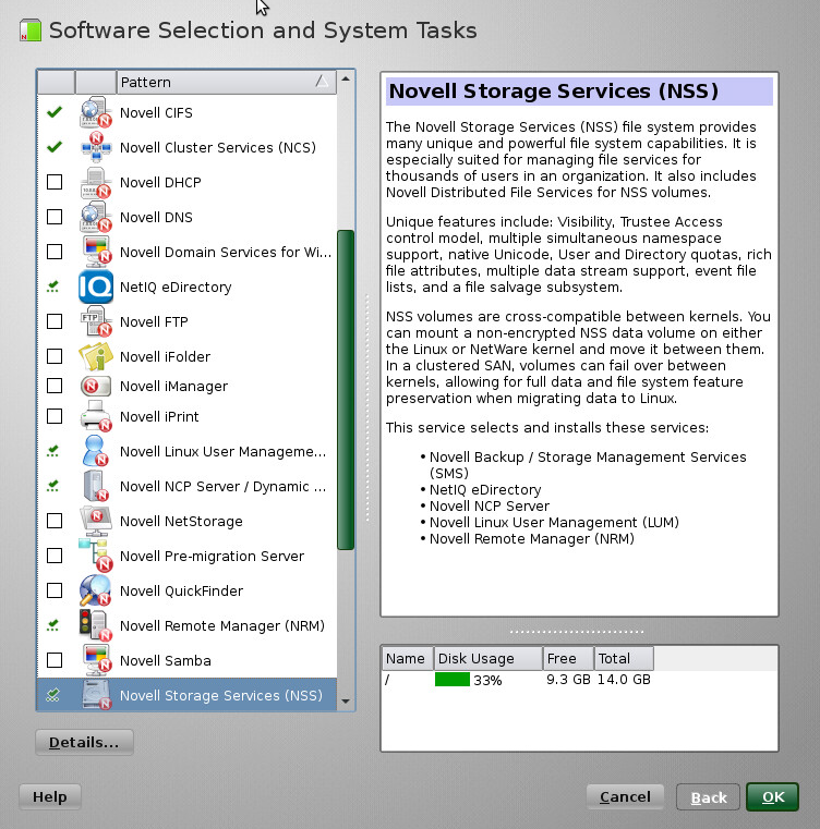 For OES 11 SP3, in the YaST install, use the Software Selection and Systems Tasks menu to select Novell Storage Services from the OES Services menu. This choice automatically selects these additional OES services that are used by DFS: