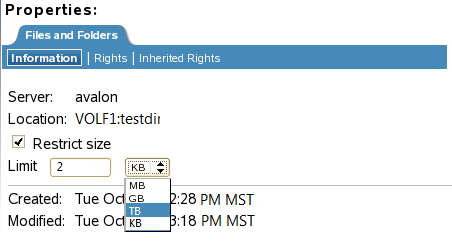 Modify a directory quota: On the Information tab, the Restrict Size check box should already be selected. In the Limit field, type the new directory quota in KB, MB, GB, or TB.