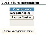 On the volume’s Share Information page under Volume Tasks > Remove Shadow Action Options, click Remove Shadow.