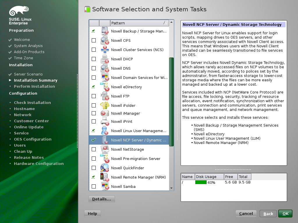 Under Open Enterprise Server, select Novell NCP Server / Dynamic Storage Technology.