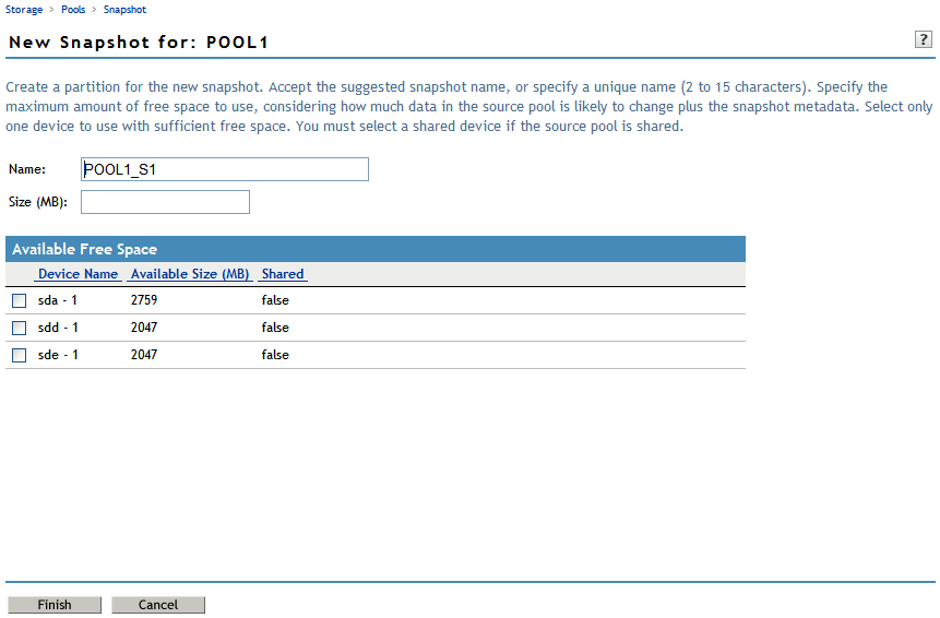 IMPORTANT:You might see an error message if the iManager connection to the server you are managing times out before the snapshot is created. The pool snapshot creation should continue on the managed server. If a timeout error occurs, navigate to the Snapshots page to view and manage the snapshot.