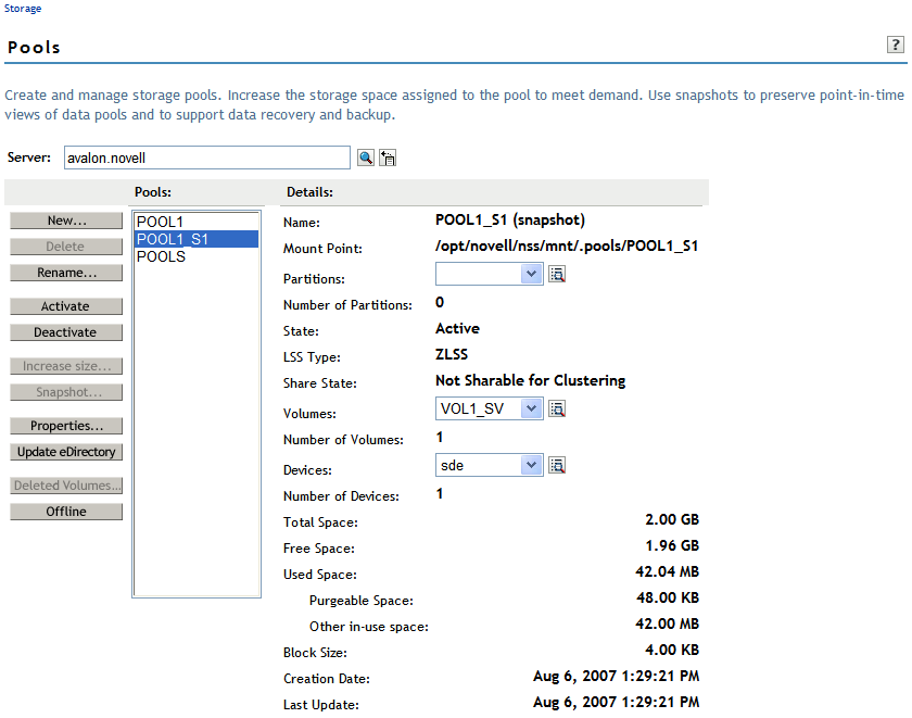 Wait for the page to refresh. It displays the pool snapshot’s details and enables its management options. The Name is followed by snapshot in parens to indicate that the selected pool is a snapshot.
