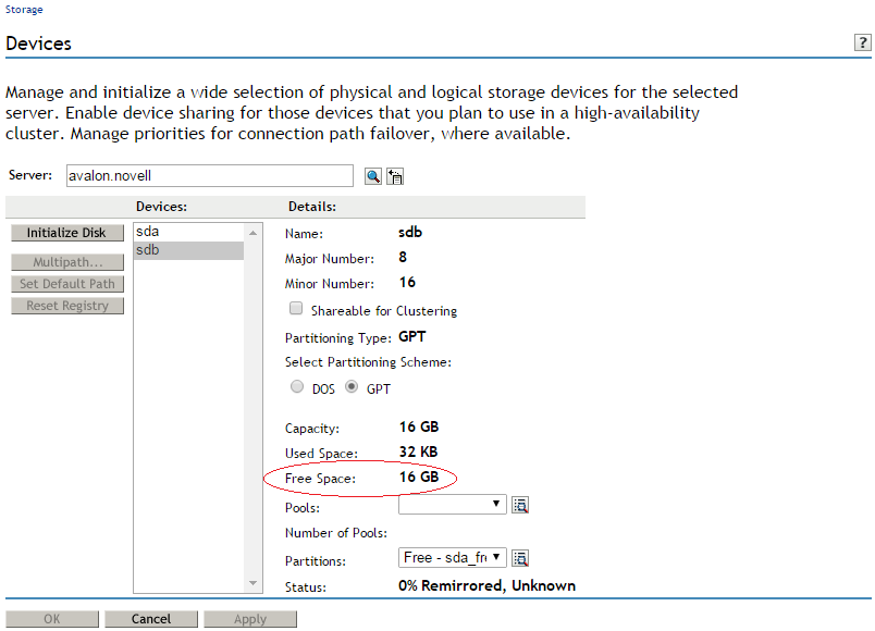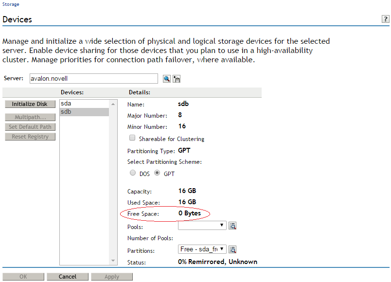 When the page refreshes, the device is initialized and available for further configuration with NSS pools and volumes.