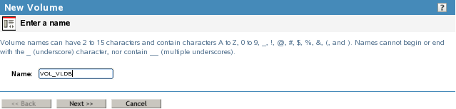 If the name you provide is not unique, you receive an error message. For guidelines about naming volumes, see Section 5.4, Naming NSS Storage Objects.
