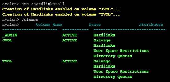 You can verify that the hard links attribute is set for the volume by entering the following command at the NSS Console (nsscon):