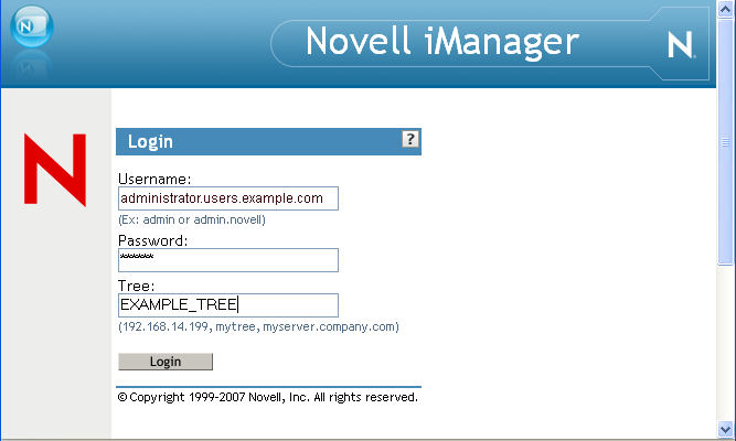 IMPORTANT:Contextless logins using iManager can lead to unexpected results if you try logging in as an administrator. An administrator object exists for every domain and you might accidently attempt to log in as an administrator of an domain where you lack sufficient access.