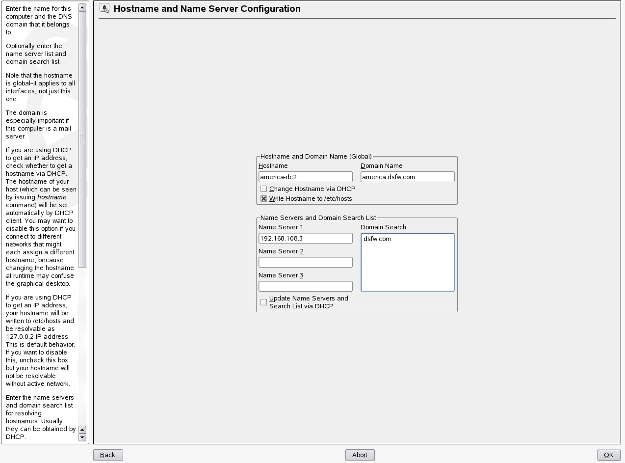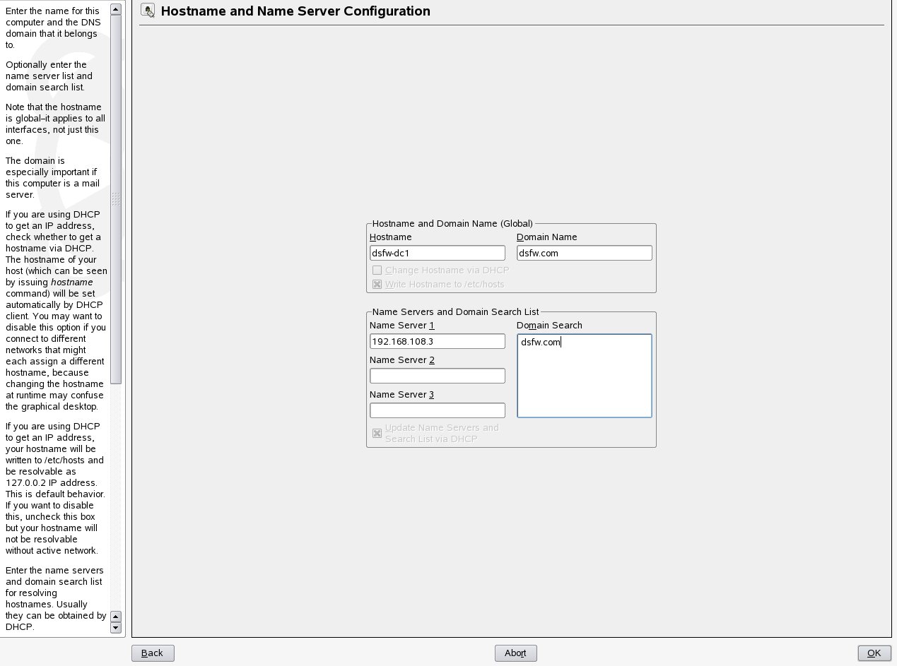 Verify that the Name Server 1 points to a DSfW domain controller that is also acting as the DNS server. By default the first domain controller of the first domain will always host the DNS server. However, for the first domain controller of the first domain, Name Server 1 must be the IP address of the local server. For details see, DNS Server is Installed.