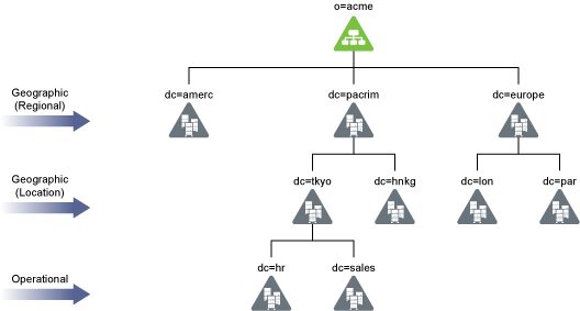 The alternative to the pyramid design is a flat tree that places all objects at one level of the tree. However, the flat tree design is not supported in DSfW. DSfW can have only one top level domain and all the other domains need to be organized underneath the top level domain.If you have mapped an existing container to a domain, you cannot map the sibling containers to create a domain. It is also not possible to partition the root container and map it to create a DSfW forest.