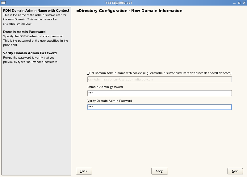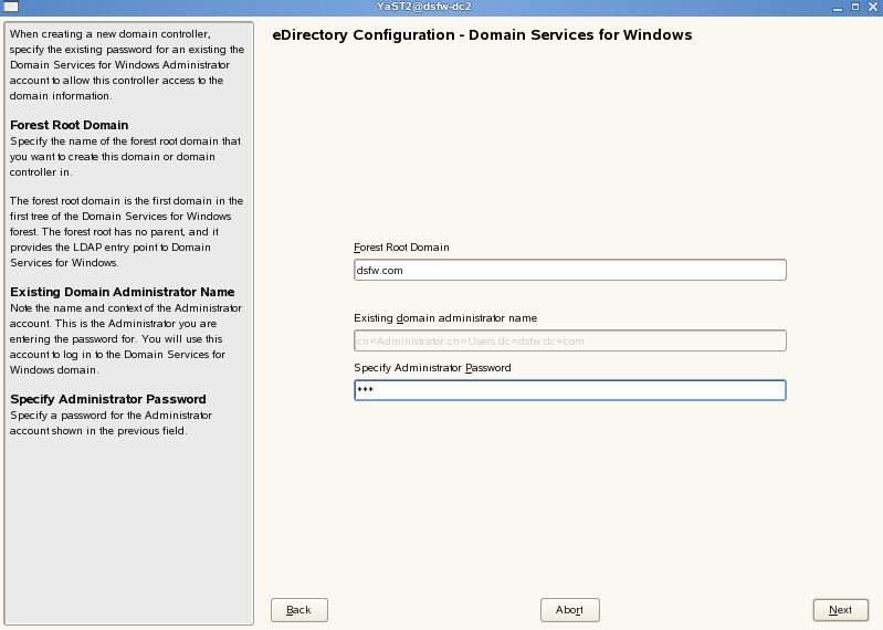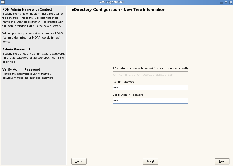NOTE:The administrator name is hard-coded. However, after completing DSfW installation and configuration (post provisioning), you can modify administrator details such as the administrator name. For more information, see Section 8.2, Renaming Administrator Details Using MMC.