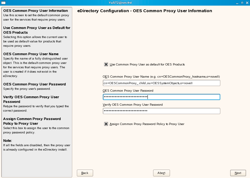 To use common proxy for DSfW, select the check box. When this check box is selected, the OES Common Proxy User Name and Password fields get enabled. These fields are populated with system generated user name and password. However, you can change these values. To change these values see Step 11.b.