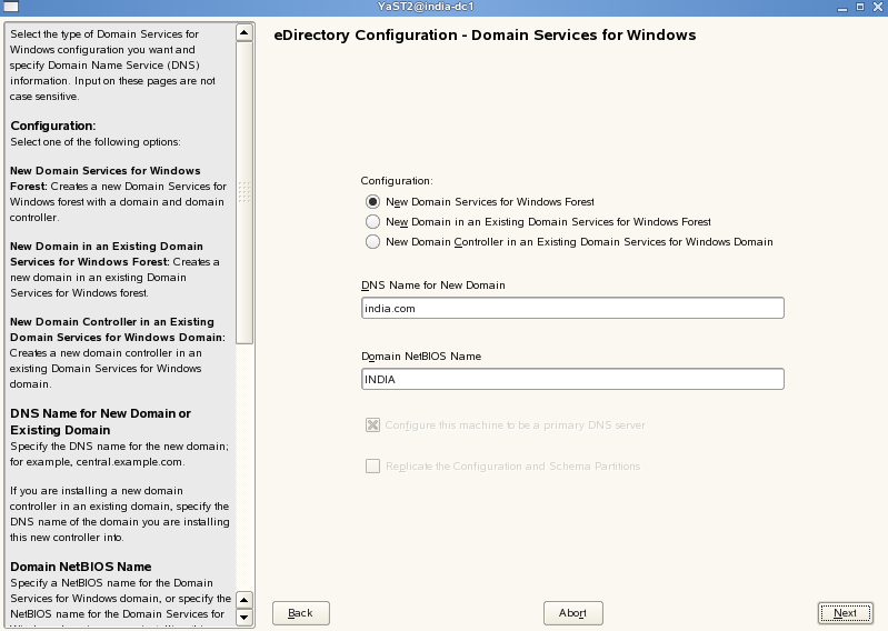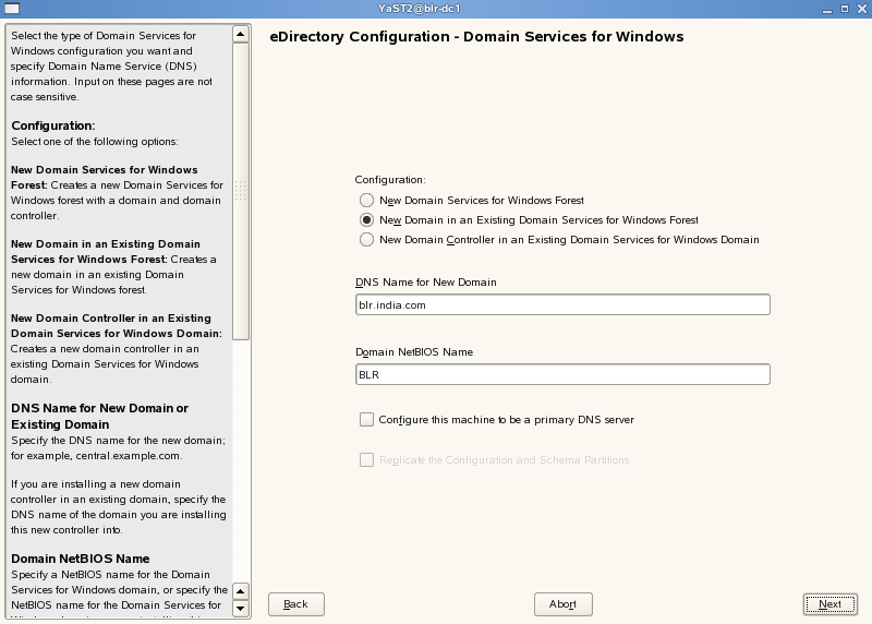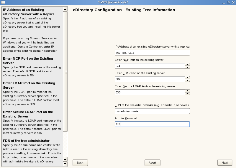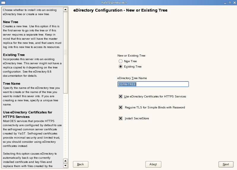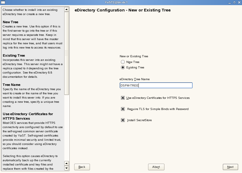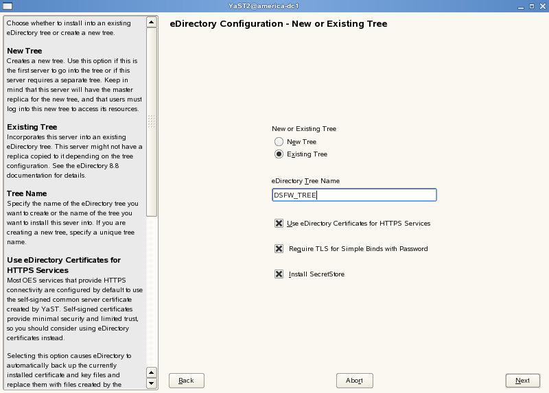 On the first eDirectory configuration page in YaST, select the option. This indicates that you are installing the server into an existing eDirectory tree: