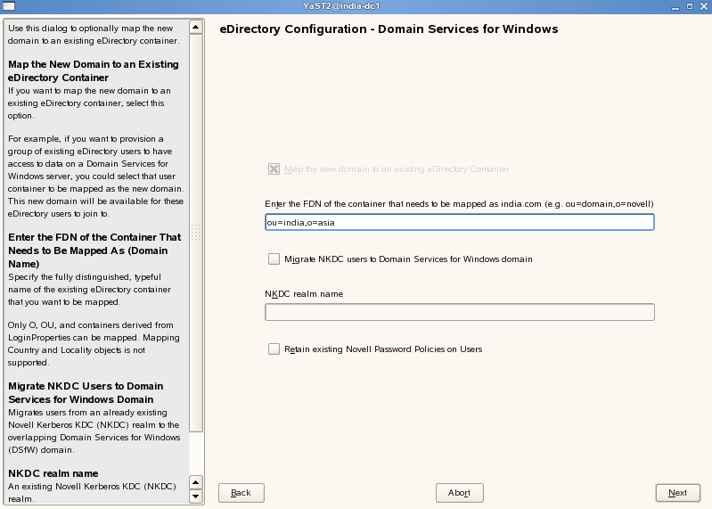 Enter the Fully Qualified Domain Name of the existing eDirectory container that you want to be mapped to the new domain.