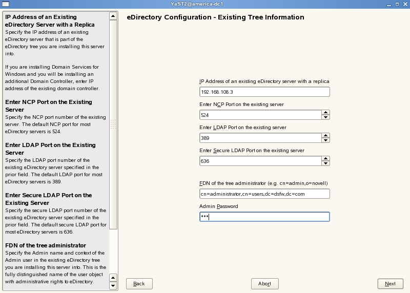 On the eDirectory configuration page in YaST, select the option. This indicates that you are installing the server into an existing eDirectory tree: