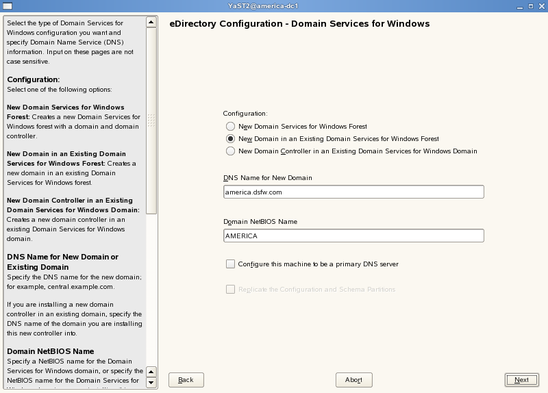 Select the option. This indicates that you setting up a new domain in an existing DSfW forest.
