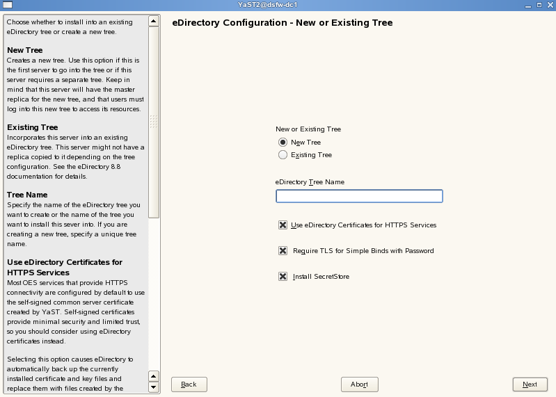 On the first eDirectory configuration page in YaST, select the option. This indicates that you are installing the first server in the tree: