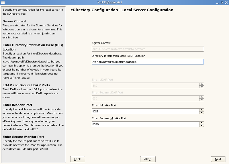 Do not change the NCP Port, LDAP Port and Secure LDAP Port information. However, if the administrator has configured existing eDirectory server with non-default ports then the installation will fail.