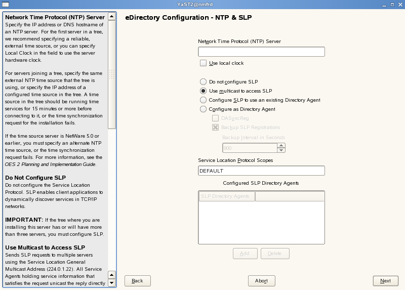 Specify a reliable Network Time Protocol (NTP) provider. Novell eDirectory requires that all servers in a tree be time-synchronized. In a single-server scenario, you can specify the local machine as the NTP provider.